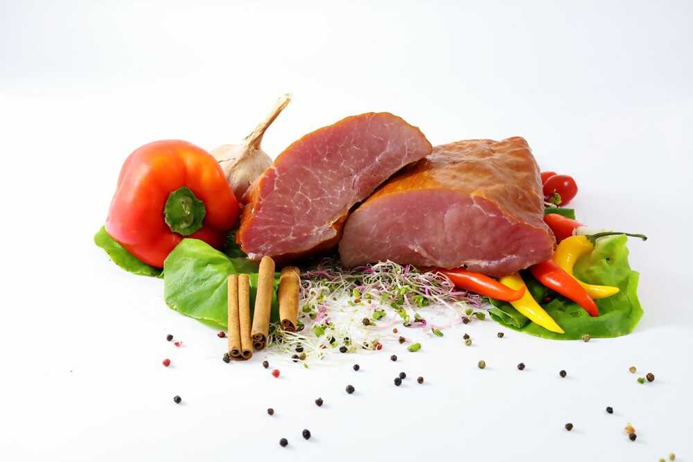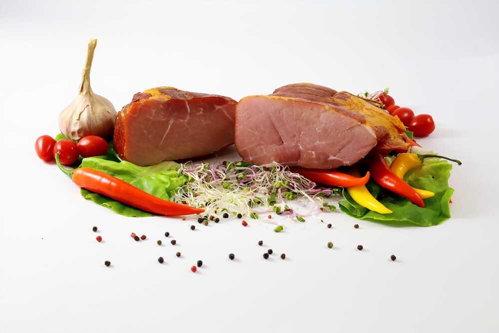 Produkt wieprzowy, wędzony, surowy. Wędlina wieprzowa wytwarzana z elementów szynki.